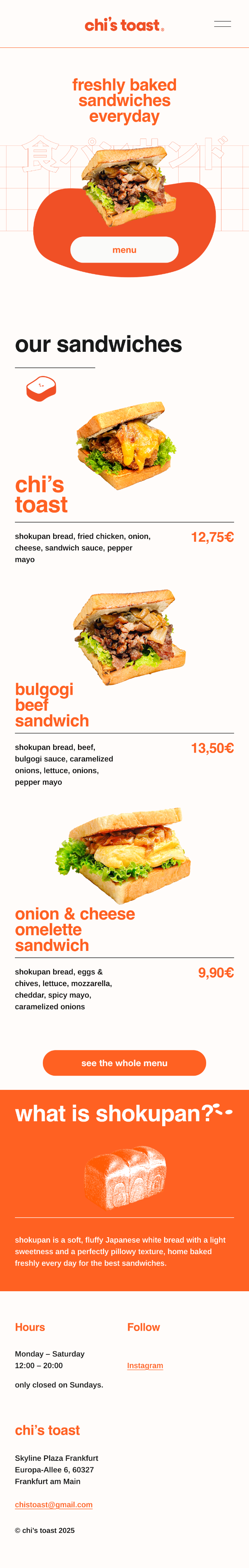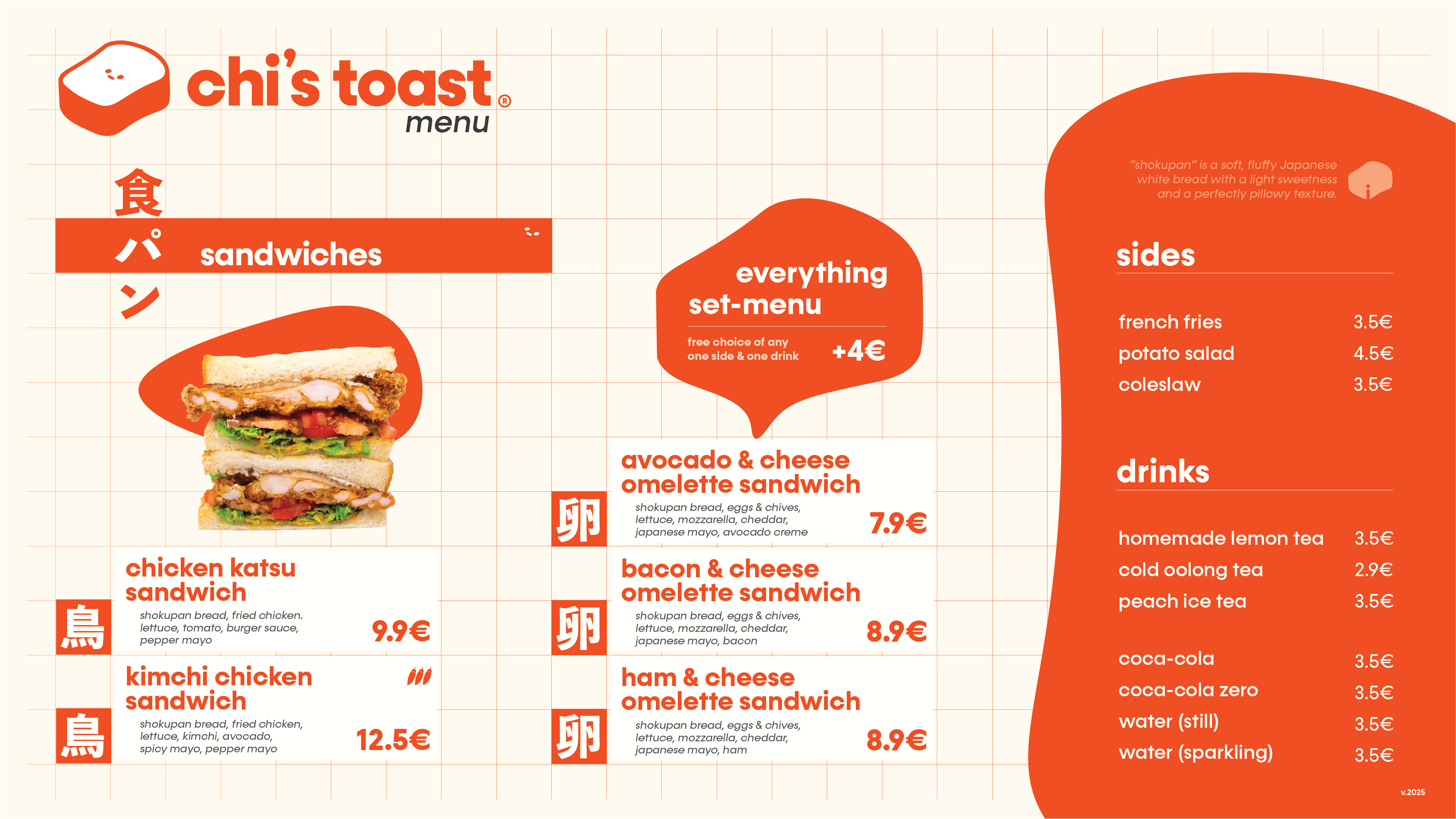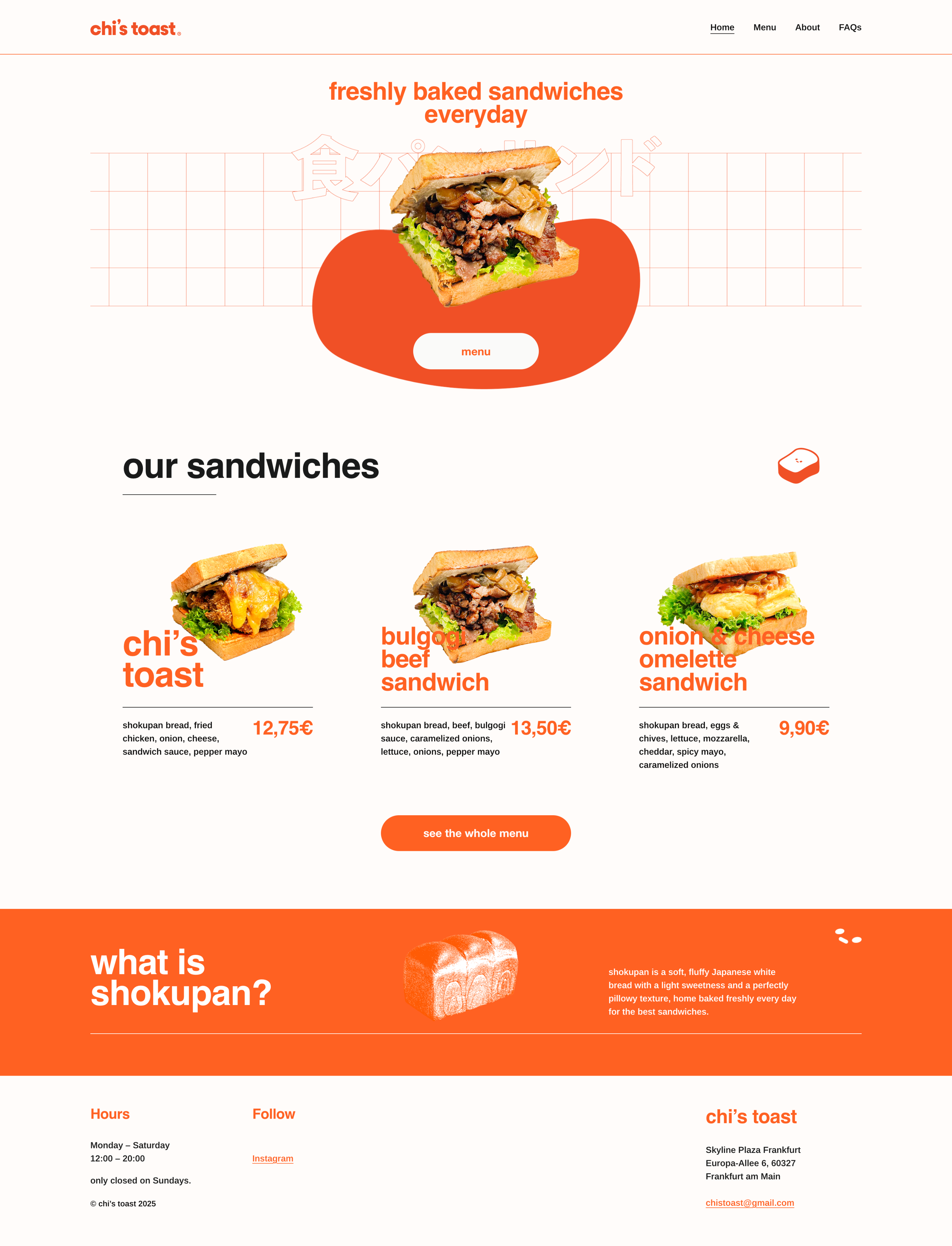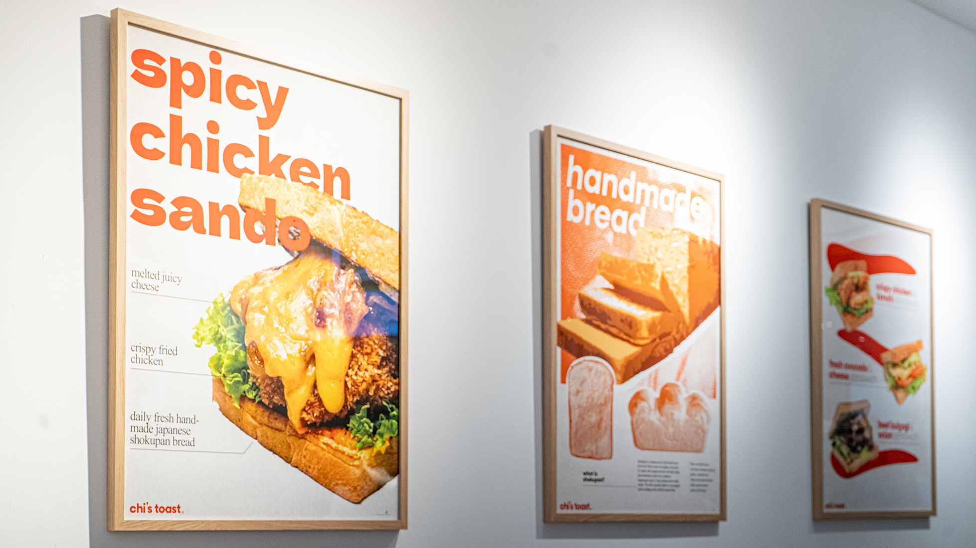 With Japanese Shokupan at the center and being located in a shopping mall with a lot of foot traffic, chi’s toast was looking for a brand identity that conveys an elevated fast-food take-out vibe, while keeping the Japanese core identity.